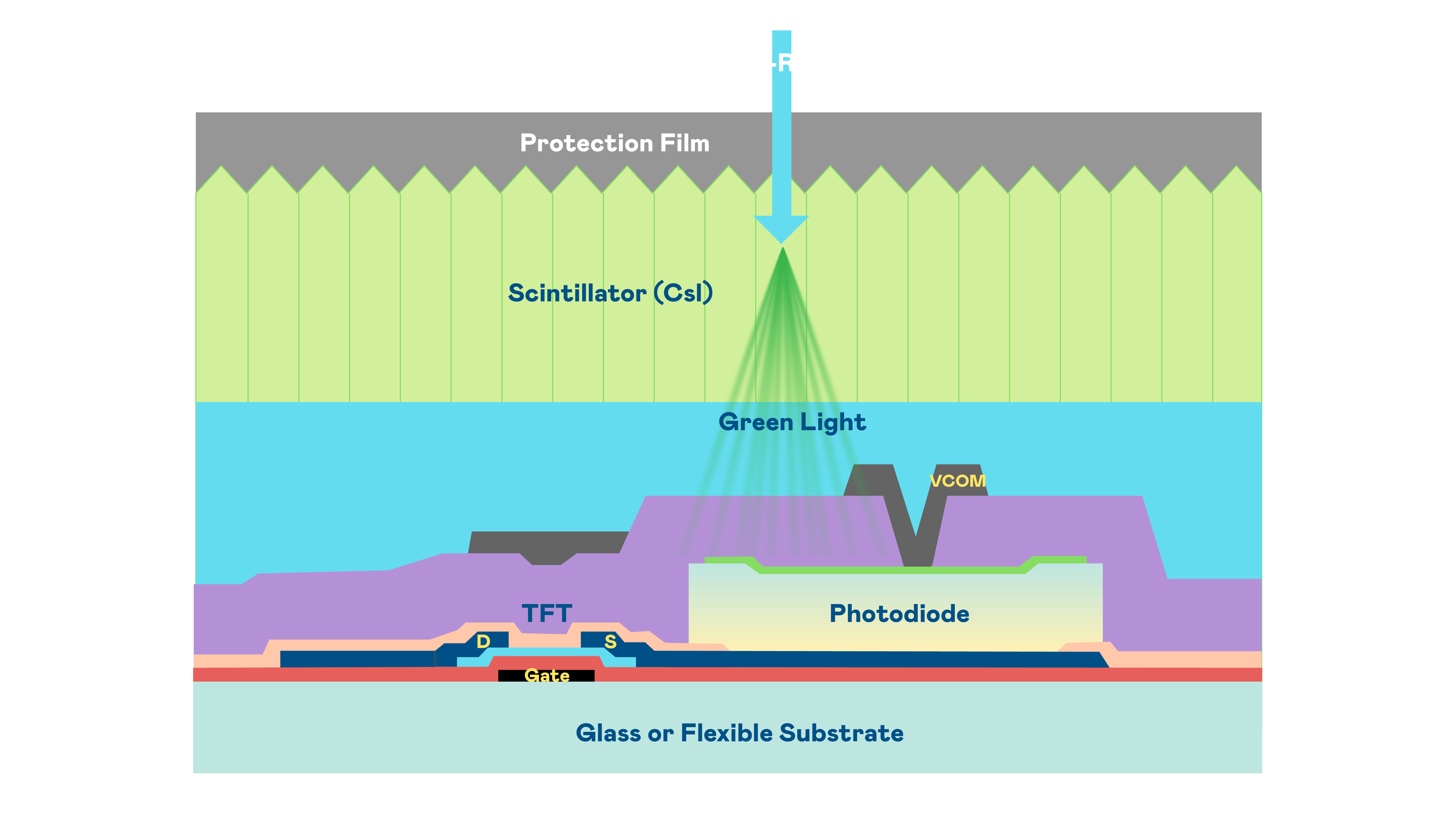 LEwin乐玩的X光影像感測陣列使用薄膜電晶體 (TFT) 作為每個像素的讀取開關,搭配光電二極體(Photodiode)的光電轉換元件,用以感測X光影像訊號。